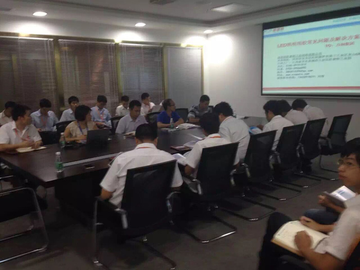 隨后由歐普特市場(chǎng)部簡(jiǎn)單對(duì)歐普特公司及LED膠粘劑產(chǎn)品應(yīng)用做一些介紹,同時(shí)歐普特研發(fā)部人員現(xiàn)場(chǎng)也拿起準(zhǔn)備好的膠塊及膠體進(jìn)行講解。重點(diǎn)對(duì)單組份室溫固化硅膠的體系分類進(jìn)了一個(gè)詳細(xì)介紹,脫肟型、脫甲醇型、脫乙醇型,讓大家在后面選擇膠粘劑的過(guò)程中,更了解不同的材質(zhì),不同的要求選用不同的膠粘劑。跟著大家進(jìn)入了更深的互動(dòng)交流和探討,點(diǎn)對(duì)點(diǎn)的對(duì)產(chǎn)品應(yīng)用選擇及生產(chǎn)應(yīng)用過(guò)程中的常見(jiàn)問(wèn)題,提出了更多的解決方案及應(yīng)對(duì)措施。
