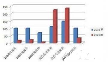 計(jì)劃還指出,至2020年LED芯片及封裝成本較2012年減少約8成、發(fā)光效率增60-100%、60W等級LED燈泡零售價將較2013年減66%。