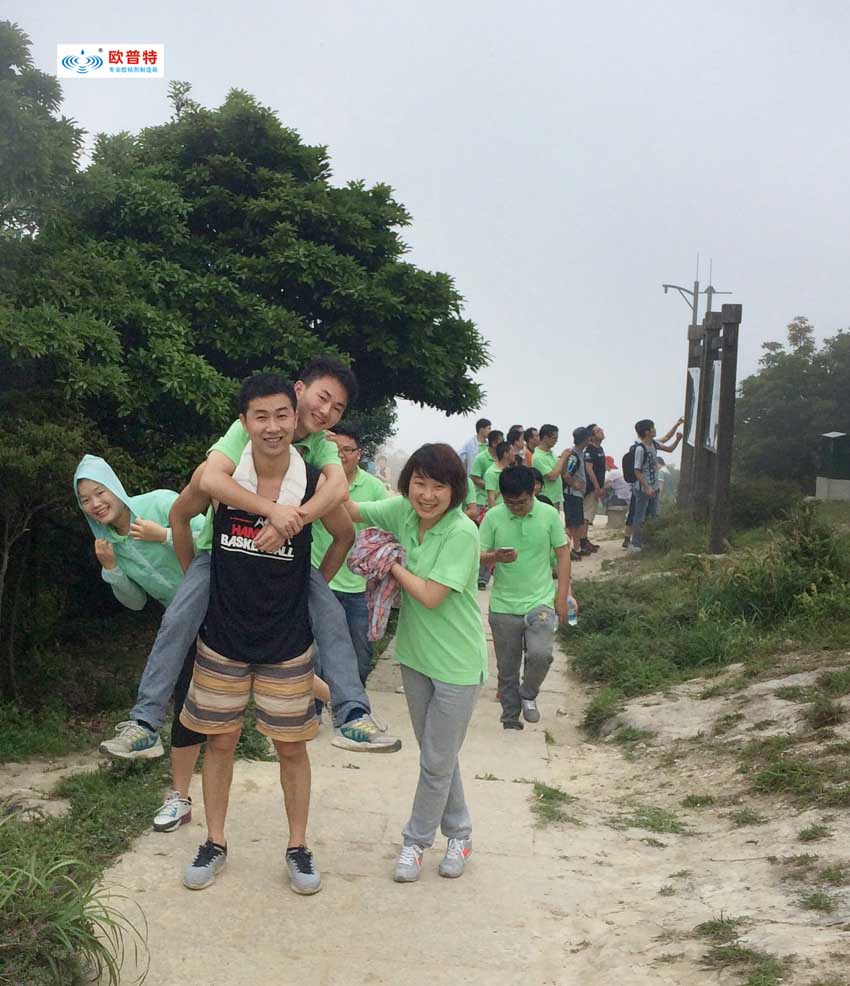 當(dāng)然每位小伙伴們體質(zhì)不一樣,有人一路狂奔,也有人慢慢落后,我們商務(wù)美女小希本來三分之一路程已然到達(dá)體能局限,準(zhǔn)備放棄,此時(shí)我們老大蔣帥伸出了他有力的大手,并不斷的鼓勵(lì),誘導(dǎo)小伙伴設(shè)立自己小目標(biāo),然后到達(dá)終點(diǎn)。這正是我們歐普特人不放棄,不拋棄每一位家人。使我印象最深刻的是:當(dāng)最后一位小伙伴沖向山頂,一起和團(tuán)隊(duì)擁抱匯合的時(shí)候,我們留下了激動(dòng)喜悅淚水。人一定要有自己設(shè)定的目標(biāo),并把他一一分解成每一個(gè)小目標(biāo),逐一完成,建立自己的信心,直至完成終極目標(biāo)!